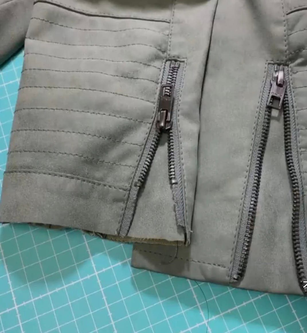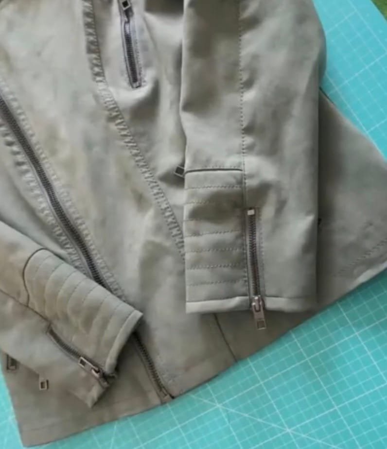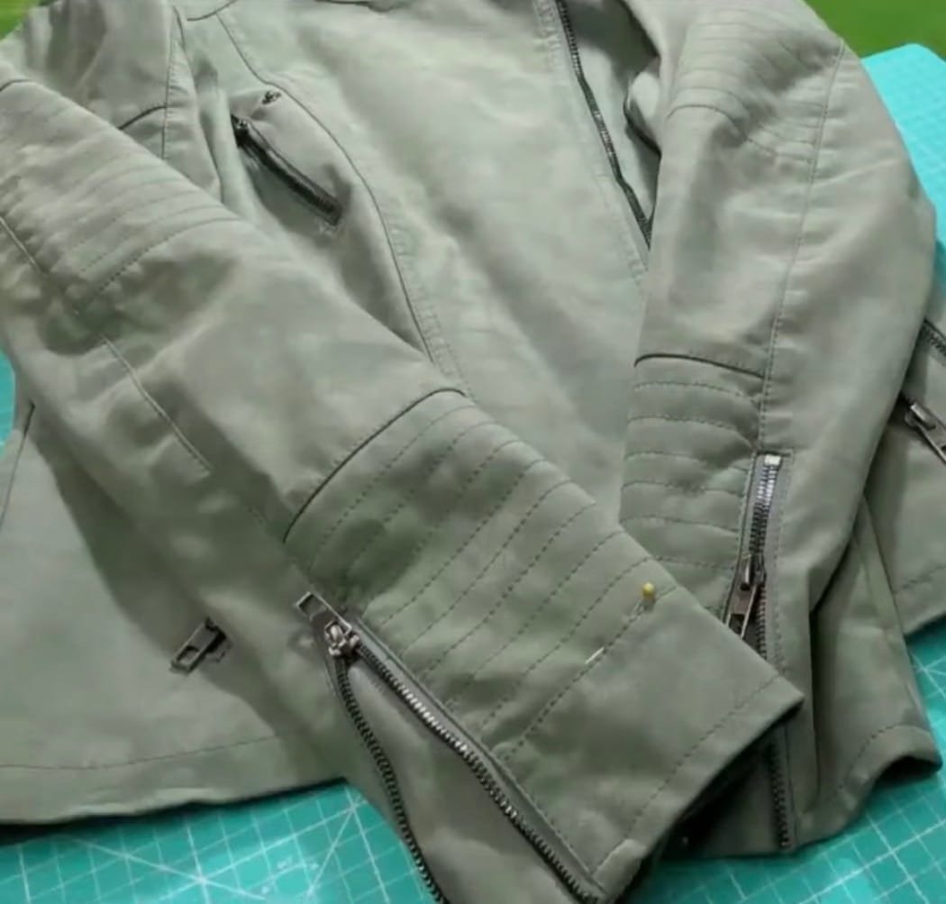 Como se ve en las imágenes, estas chaquetas suelen tener costuras horizontales (estilo motero). Asegúrate de alinear bien estas líneas al cerrar el nuevo bajo para que el diseño se vea continuo y profesional.